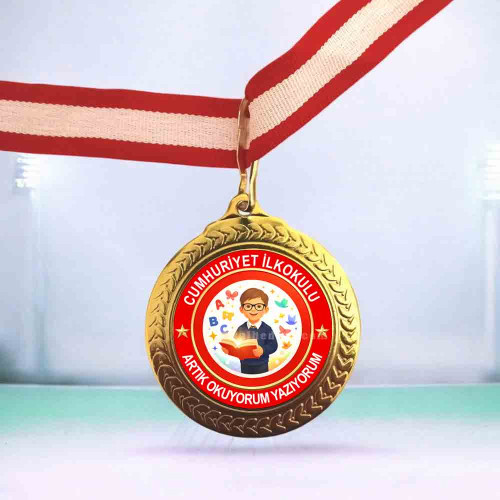 Parlak altın rengi metalden, kabartmalı kenar deseniyle ve kırmızı beyaz kurdele ile üretilmiştir. Madalya üzerinde okul adı (Örn: CUMHURİYET İLKOKULU), kitap okuyan, gözlüklü (bilge) öğrenci figürü, ABC harfleri ve **"ARTIK OKUYORUM YAZIYORUM"** ibaresi yer alır.