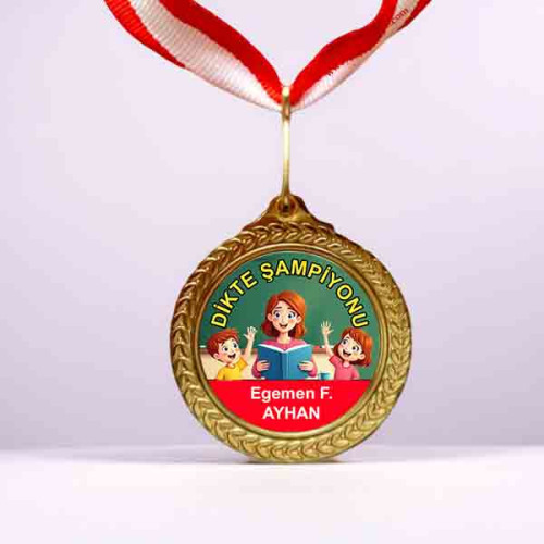 Etiketler: madalya, dikte, şampiyonu, okuma, yazma, başarı, öğrenci, isme özel, Türkçe, okul, ödül, altın madalya, kurdeleli