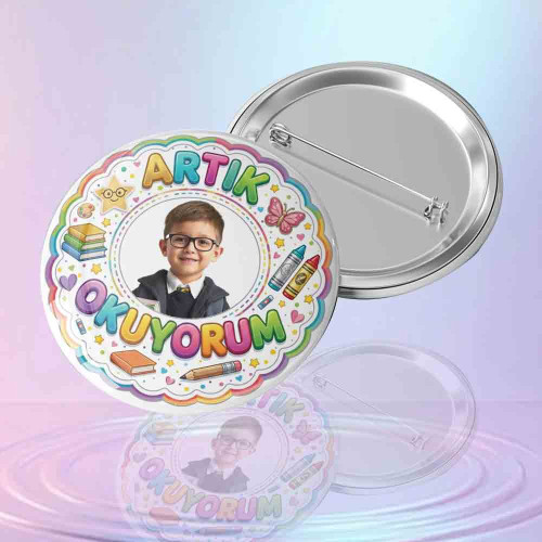 İlkokul birinci sınıf öğrencilerinin en heyecanlı dönemi olan okumaya geçiş sürecini ölümsüzleştirmek için tasarlanmış "Fotoğraflı "Artık Okuyorum" metal yaka rozetidir. Okuma Bayramı kutlamalarında öğrencilere verilecek en anlamlı, kişiye özel ve kalıcı hatıralardan biridir.