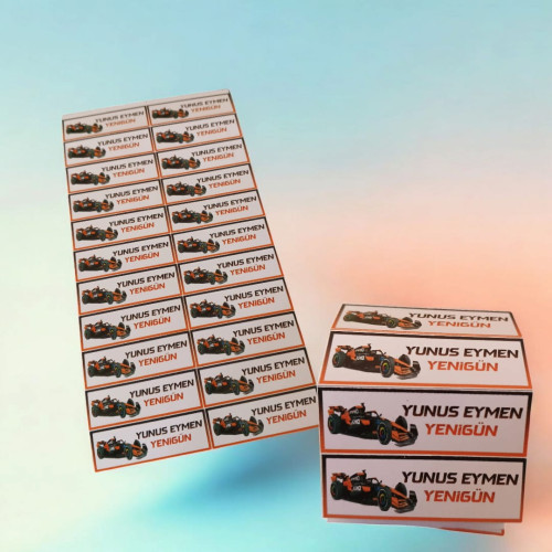 Okulda, evde veya özel günlerde hediye olarak ideal. Her etikette "YUNUS EYMEN" ismi ve hızlı bir yarış arabası görseli bulunur.