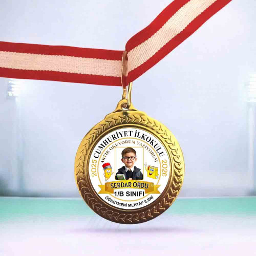 1. sınıf öğrencilerinin okuma-yazma başarısını kutlamak için tasarlanmış en özel madalyadır. Üzerinde; öğrencinin fotoğrafı, adı-soyadı (Örn: SERDAR ORDU),