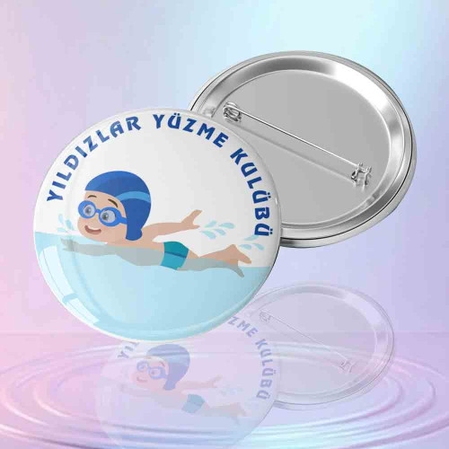 • Mavi su temalı zemin üzerinde yüzen çocuk figürlü Yıldızlar Yüzme Kulübü yazılı buton rozet